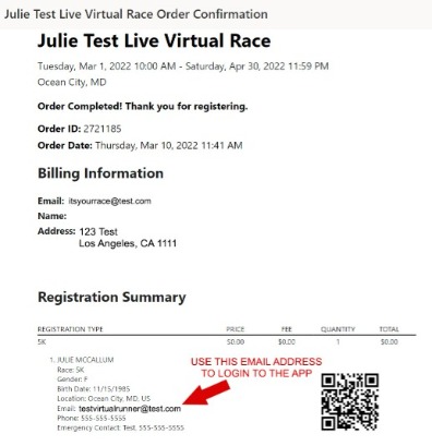 If you registered more than 1 participant in an order, each participant will need to download the ITS YOUR RACE app and create their own account using the same email address that is listed under their PARTICIPANT record in the event. Check your race registration confirmation email to verify which email address is associated with each participant. See the screenshot to the left to identify the email address that should be used as your login.